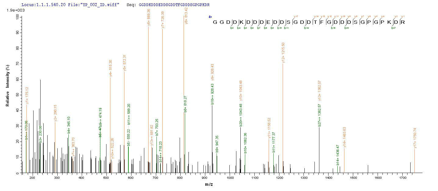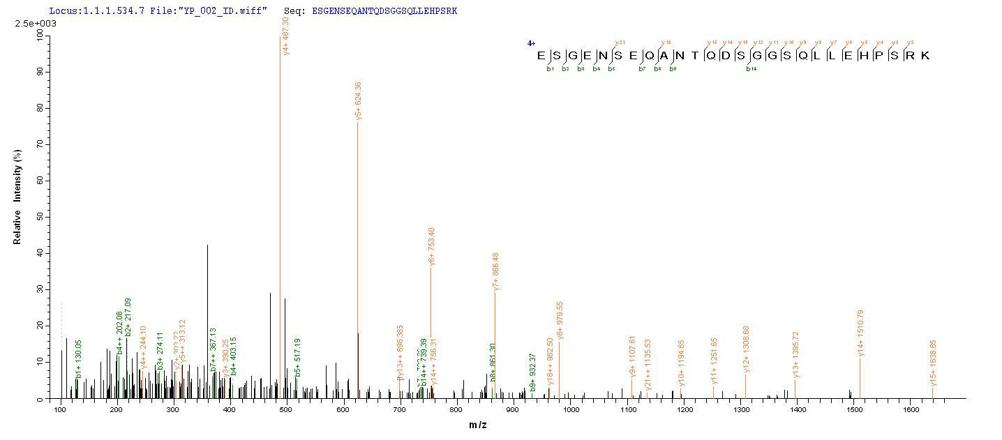 Based on the SEQUEST from database of Yeast host and target protein, the LC-MS/MS Analysis result of CSB-YP006967HU could indicate that this peptide derived from Yeast-expressed Homo sapiens (Human) DMP1.
