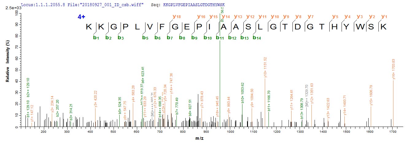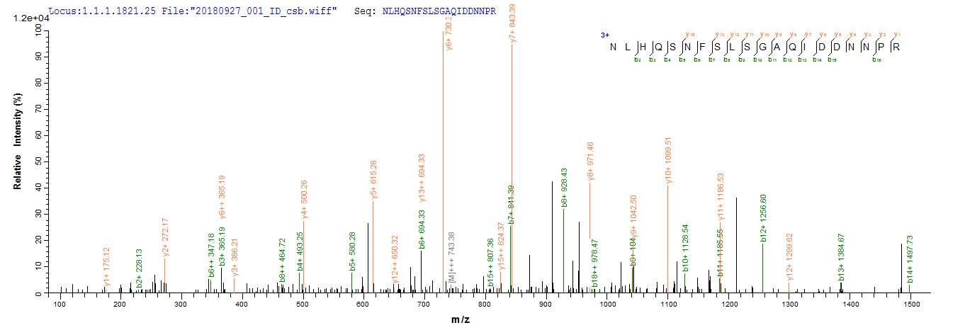 Based on the SEQUEST from database of E.coli host and target protein, the LC-MS/MS Analysis result of CSB-EP623907HU could indicate that this peptide derived from E.coli-expressed Homo sapiens (Human) CRMP1.
