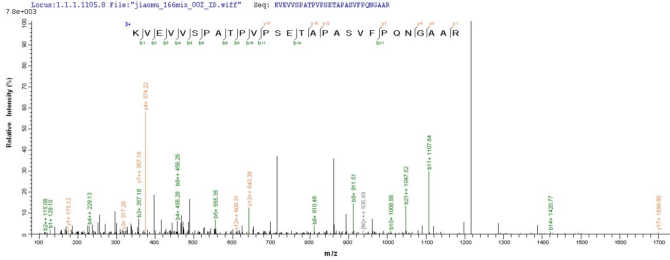 Based on the SEQUEST from database of E.coli host and target protein, the LC-MS/MS Analysis result of CSB-RP178494h could indicate that this peptide derived from E.coli-expressed Homo sapiens (Human) KAT5.