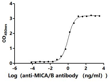 Measured by its binding ability in a functional ELISA.Immobilized Human MICA at 2 μg/ml can bind Anti-MICA/B recombinant antibody (CSB-RA56059MA1HU). The EC50 is 0.9163-1.108 ng/mL. Biological Activity Assay