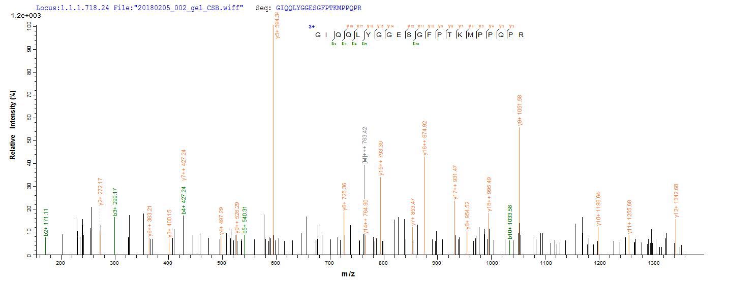 Based on the SEQUEST from database of E.coli host and target protein, the LC-MS/MS Analysis result of CSB-EP014661HU could indicate that this peptide derived from E.coli-expressed Homo sapiens (Human) MMP14.