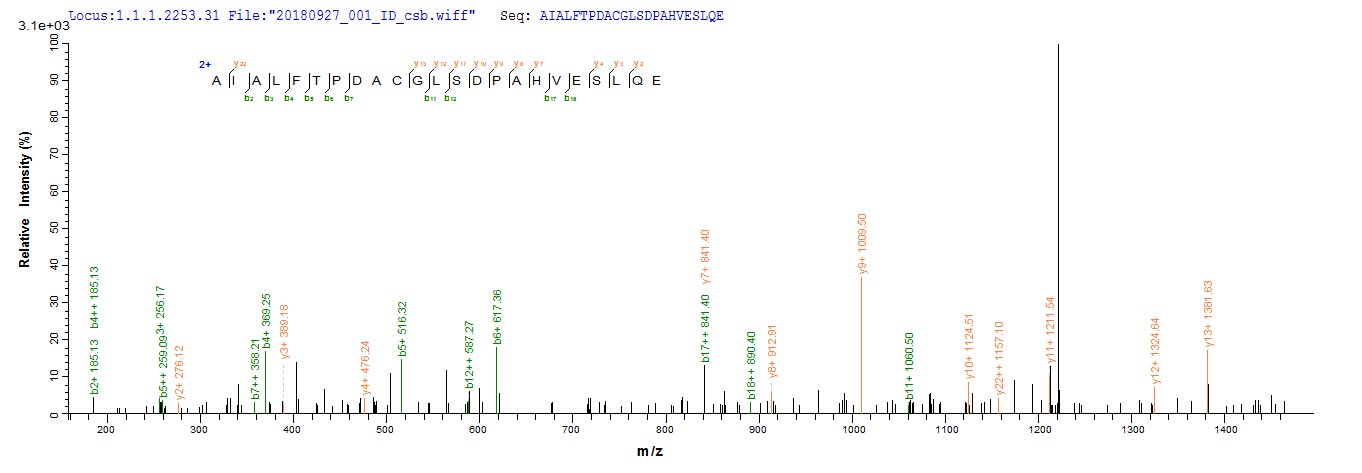 Based on the SEQUEST from database of E.coli host and target protein, the LC-MS/MS Analysis result of CSB-EP016058HU could indicate that this peptide derived from E.coli-expressed Homo sapiens (Human) NR2F6.