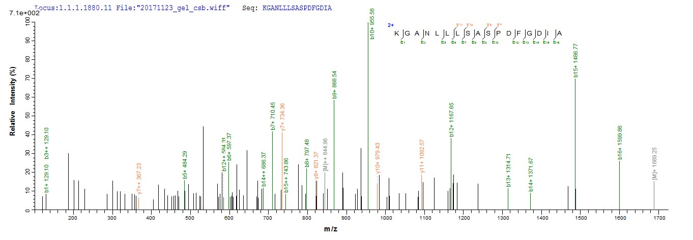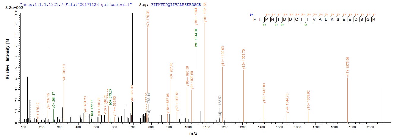 Based on the SEQUEST from database of E.coli host and target protein, the LC-MS/MS Analysis result of CSB-RP130944h could indicate that this peptide derived from E.coli-expressed Homo sapiens (Human) CANT1.
