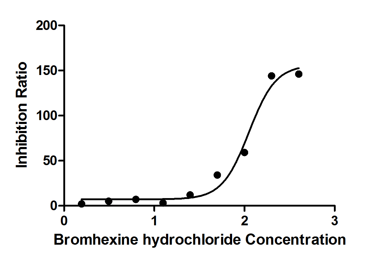 Measured by Bromhexine Hydrochloride inhibit ratio on TMPRSS2 (CSB-MP023924HU(M)b0), which can cleave fluorogenic peptide substrate (Boc-Gln-Ala-Arg-AMC). The Bromhexine Hydrochloride inhibit EC50 is 81.79-154.2μM. Biological Activity Assay