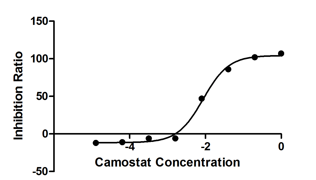 Measured by Camostat Mesylate inhibit ratio on TMPRSS2 (CSB-MP023924HU(M)b0), which can cleave fluorogenic peptide substrate (Boc-Gln-Ala-Arg-AMC). The Camostat Mesylate inhibit EC50 is 0.005877- 0.01293μM. Biological Activity Assay