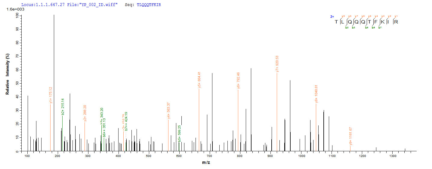 Based on the SEQUEST from database of E.coli host and target protein, the LC-MS/MS Analysis result of CSB-EP019259HU could indicate that this peptide derived from E.coli-expressed Homo sapiens (Human) RAD23A.