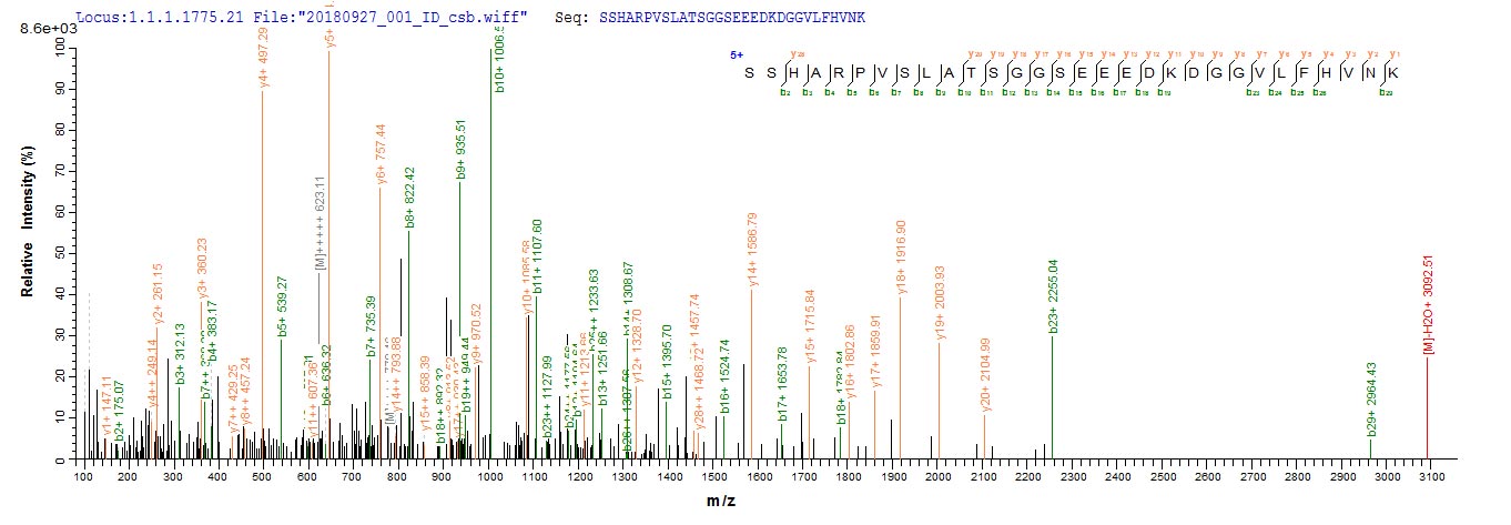 Based on the SEQUEST from database of E.coli host and target protein, the LC-MS/MS Analysis result of CSB-EP769783HU could indicate that this peptide derived from E.coli-expressed Homo sapiens (Human) VASH2.