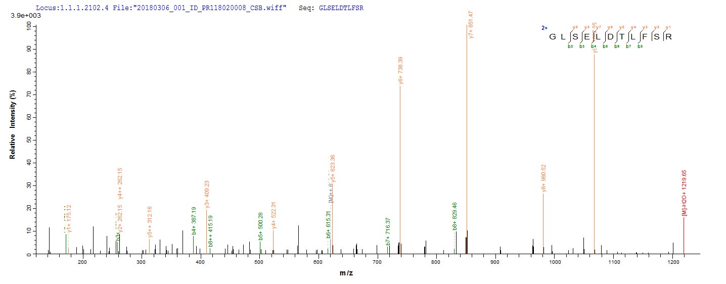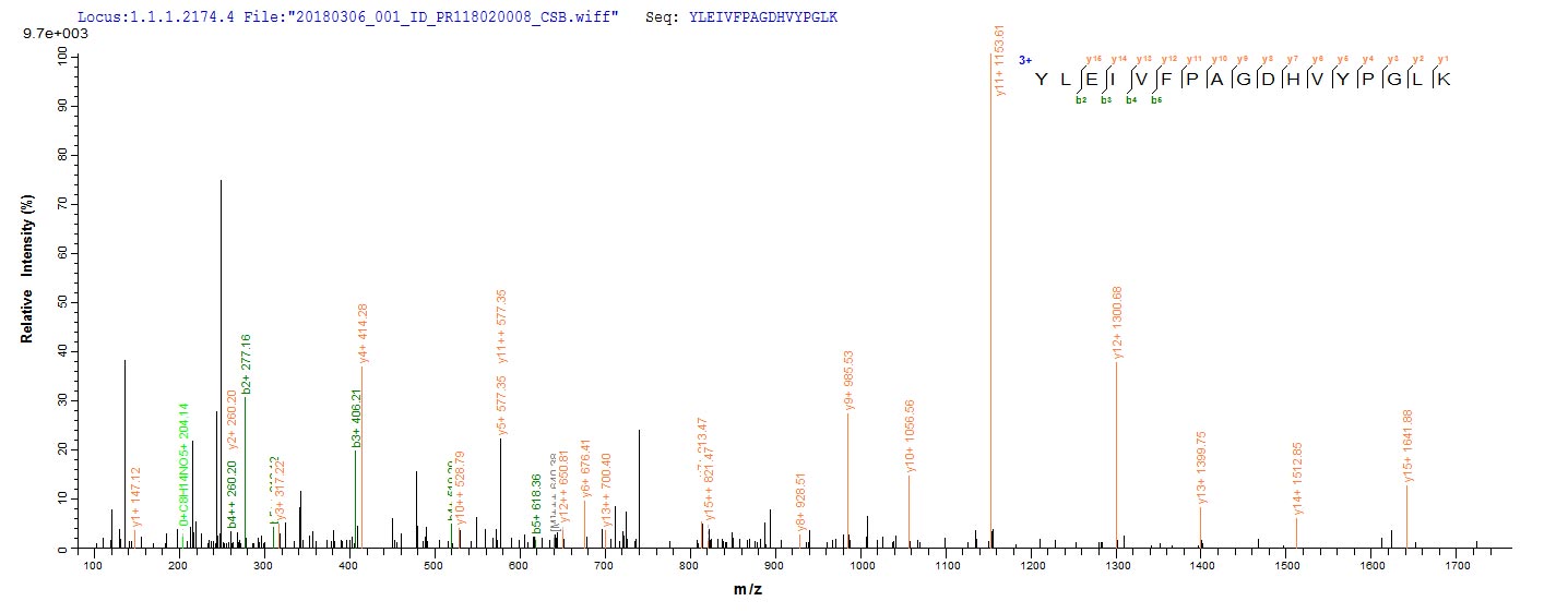 Based on the SEQUEST from database of E.coli host and target protein, the LC-MS/MS Analysis result of CSB-EP517245HWWE1 could indicate that this peptide derived from E.coli-expressed Human cytomegalovirus (strain Merlin) (HHV-5) (Human herpesvirus 5) UL111A.