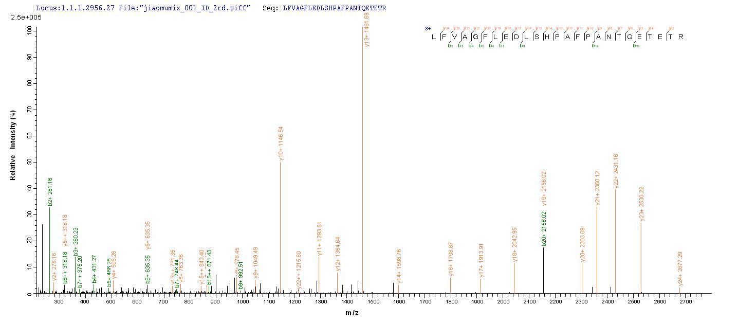 Based on the SEQUEST from database of E.coli host and target protein, the LC-MS/MS Analysis result of CSB-EP836165HSP could indicate that this peptide derived from E.coli-expressed Human herpesvirus 1 (strain KOS) (HHV-1) (Human herpes simplex virus 1) gL.