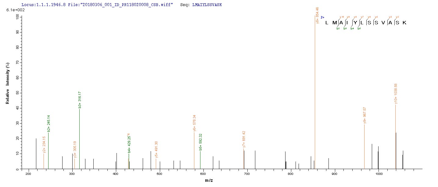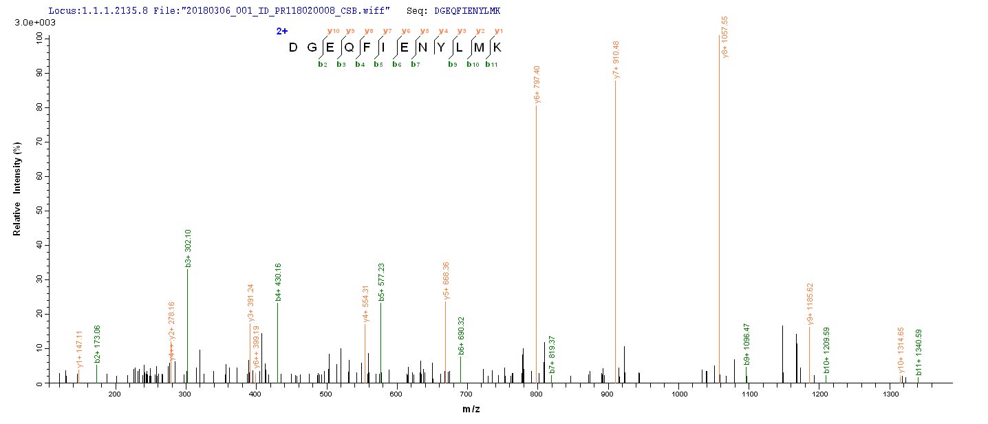 Based on the SEQUEST from database of E.coli host and target protein, the LC-MS/MS Analysis result of CSB-EP357083HPM could indicate that this peptide derived from E.coli-expressed Human parvovirus B19 (isolate AU) (HPV B19) NS1.