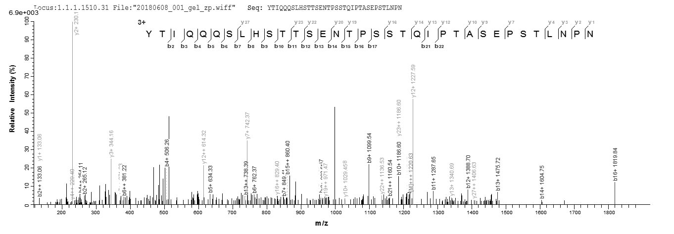 Based on the SEQUEST from database of E.coli host and target protein, the LC-MS/MS Analysis result of CSB-EP323293HPX could indicate that this peptide derived from E.coli-expressed Human respiratory syncytial virus B (strain 18537) G.