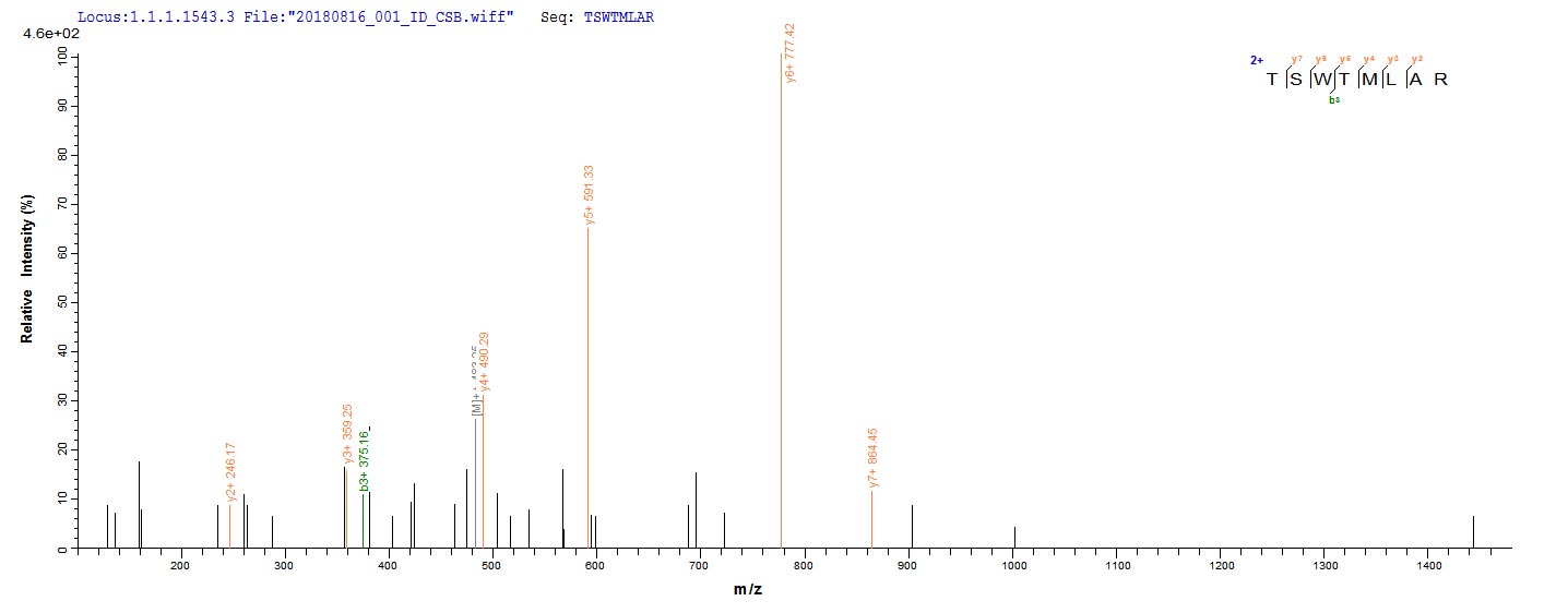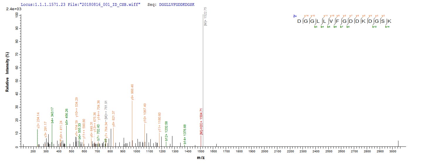 Based on the SEQUEST from database of Yeast host and target protein, the LC-MS/MS Analysis result of CSB-YP023791MO could indicate that this peptide derived from Yeast-expressed Mus musculus (Mouse) Tmem2.
