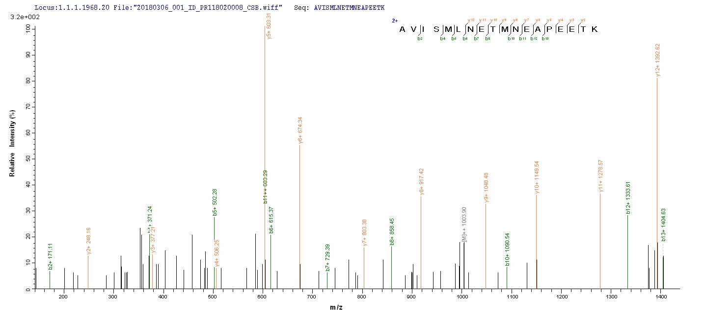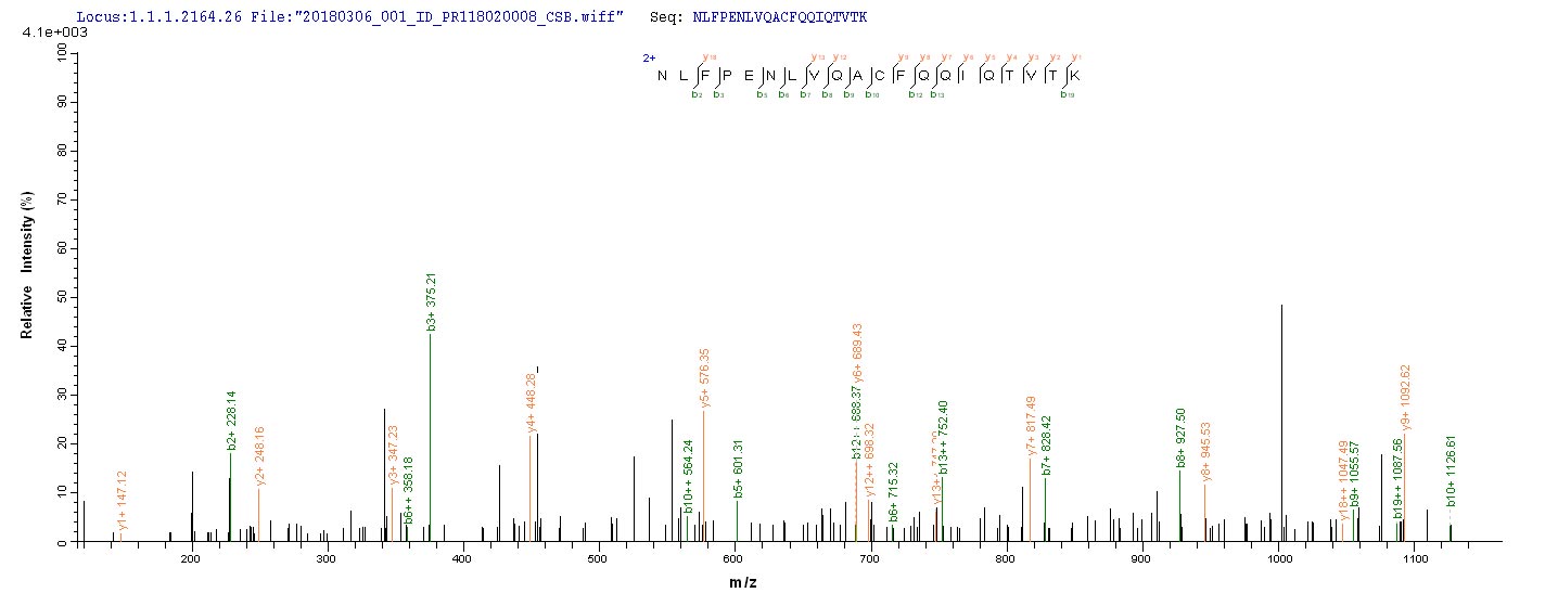 Based on the SEQUEST from database of E.coli host and target protein, the LC-MS/MS Analysis result of CSB-EP021433MO could indicate that this peptide derived from E.coli-expressed Mus musculus (Mouse) Slc1a2.