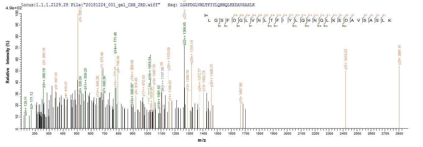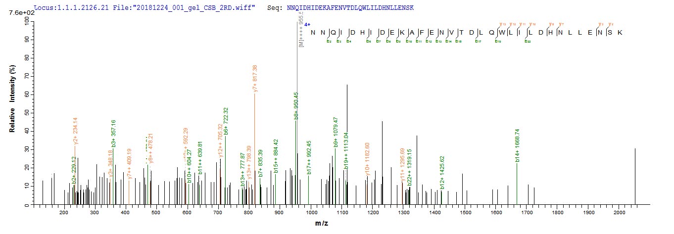 Based on the SEQUEST from database of E.coli host and target protein, the LC-MS/MS Analysis result of CSB-EP013234MO could indicate that this peptide derived from E.coli-expressed Mus musculus (Mouse) Lum.