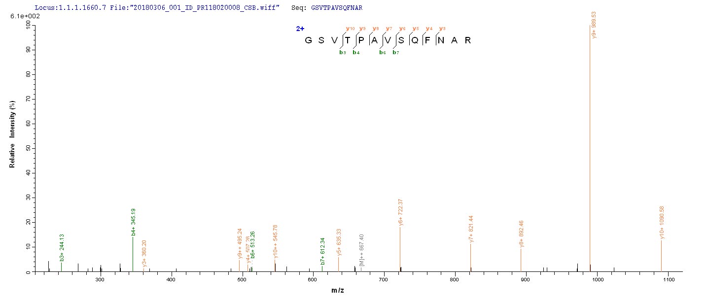 Based on the SEQUEST from database of E.coli host and target protein, the LC-MS/MS Analysis result of CSB-RP149074BA(A3) could indicate that this peptide derived from E.coli-expressed Mycobacterium tuberculosis mpt63.