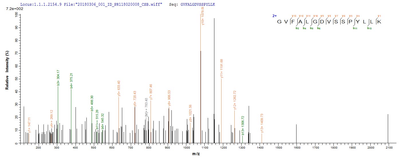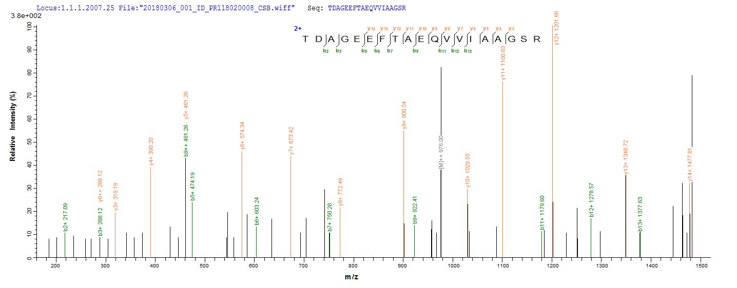 Based on the SEQUEST from database of E.coli host and target protein, the LC-MS/MS Analysis result of CSB-EP517031MVZ could indicate that this peptide derived from E.coli-expressed Mycobacterium tuberculosis (strain CDC 1551 / Oshkosh) mtr.