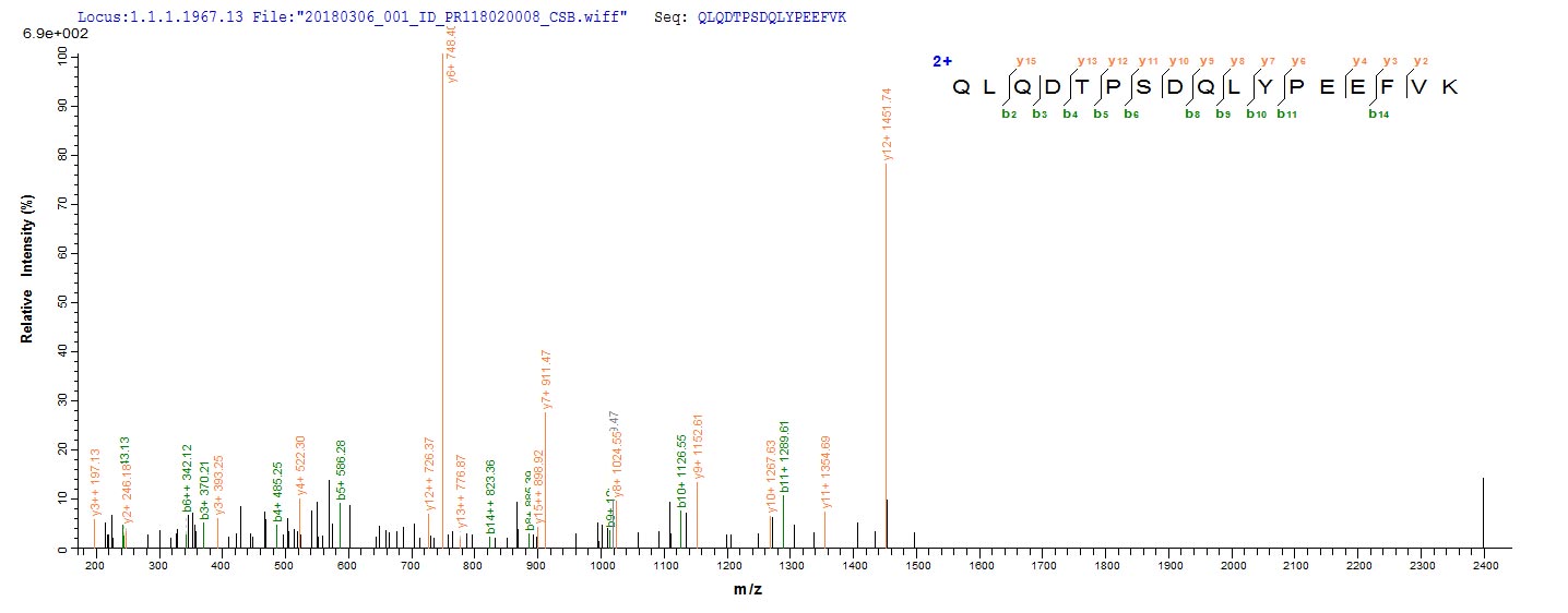 Based on the SEQUEST from database of E.coli host and target protein, the LC-MS/MS Analysis result of CSB-EP302719MLW could indicate that this peptide derived from E.coli-expressed Mycoplasma pneumoniae (strain ATCC 29342 / M129) pepA.