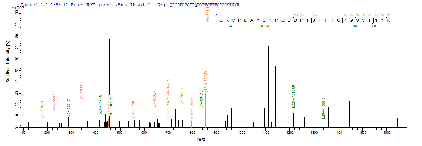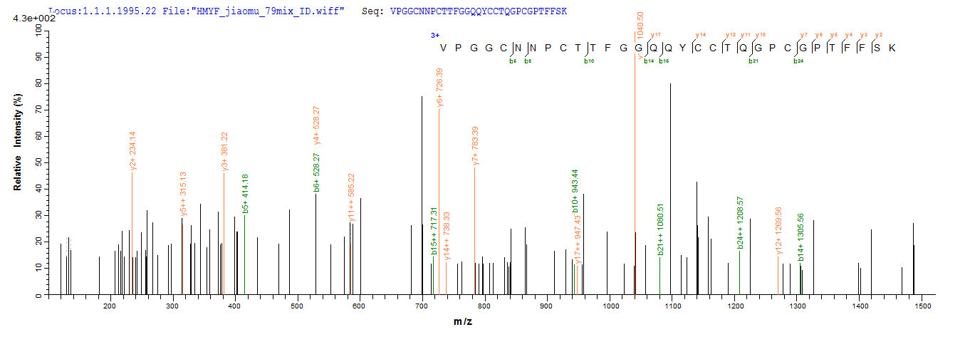 Based on the SEQUEST from database of E.coli host and target protein, the LC-MS/MS Analysis result of CSB-EP320333NHE could indicate that this peptide derived from E.coli-expressed Nicotiana tabacum (Common tobacco) AP24.