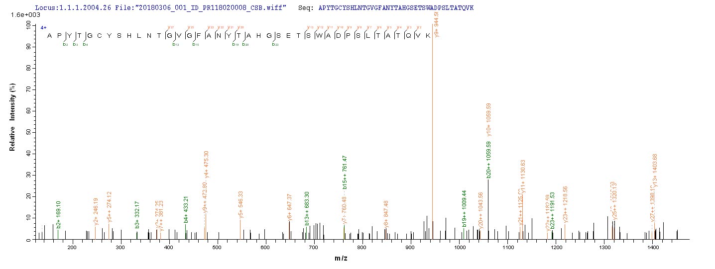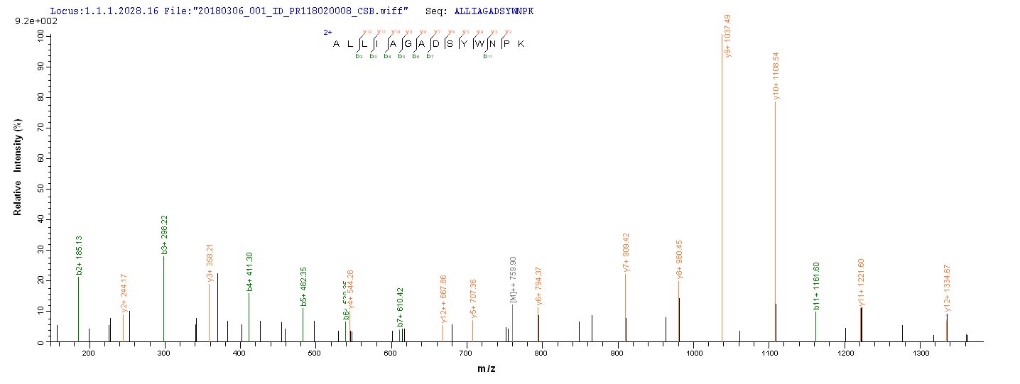Based on the SEQUEST from database of E.coli host and target protein, the LC-MS/MS Analysis result of CSB-EP464342EXZ could indicate that this peptide derived from E.coli-expressed Porphyromonas gingivalis (strain ATCC 33277 / DSM 20709 / JCM 12257) kgp.
