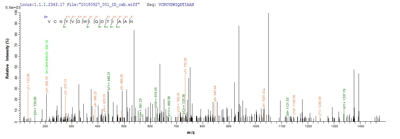 Based on the SEQUEST from database of Yeast host and target protein, the LC-MS/MS Analysis result of CSB-YP018814RA could indicate that this peptide derived from Yeast-expressed Rattus norvegicus (Rat) Prss2.