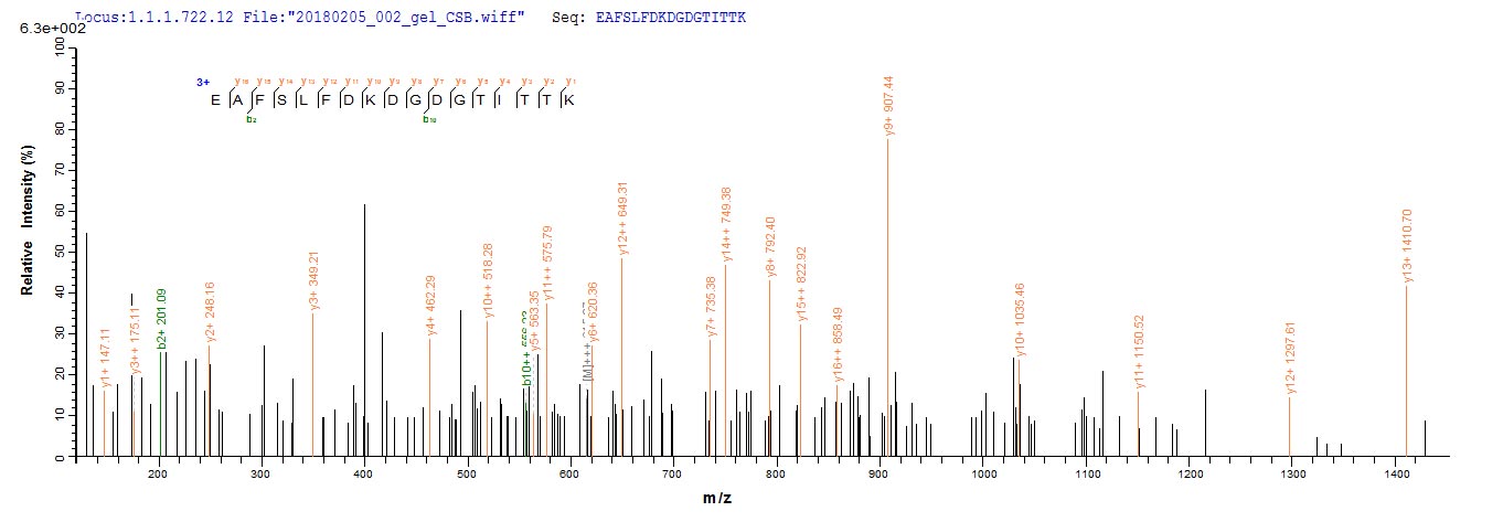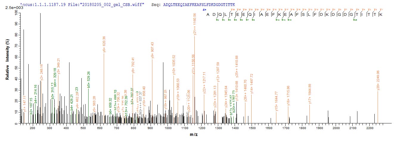 • Based on the SEQUEST from database of E.coli host and target protein, the LC-MS/MS Analysis result of CSB-EP004445RA could indicate that this peptide derived from E.coli-expressed Rattus norvegicus (Rat) Calm1.