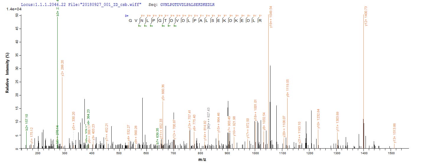 Based on the SEQUEST from database of Yeast host and target protein, the LC-MS/MS Analysis result of CSB-YP355535SVG could indicate that this peptide derived from Yeast-expressed Saccharomyces cerevisiae (strain ATCC 204508 / S288c) (Baker's yeast) CDC19.