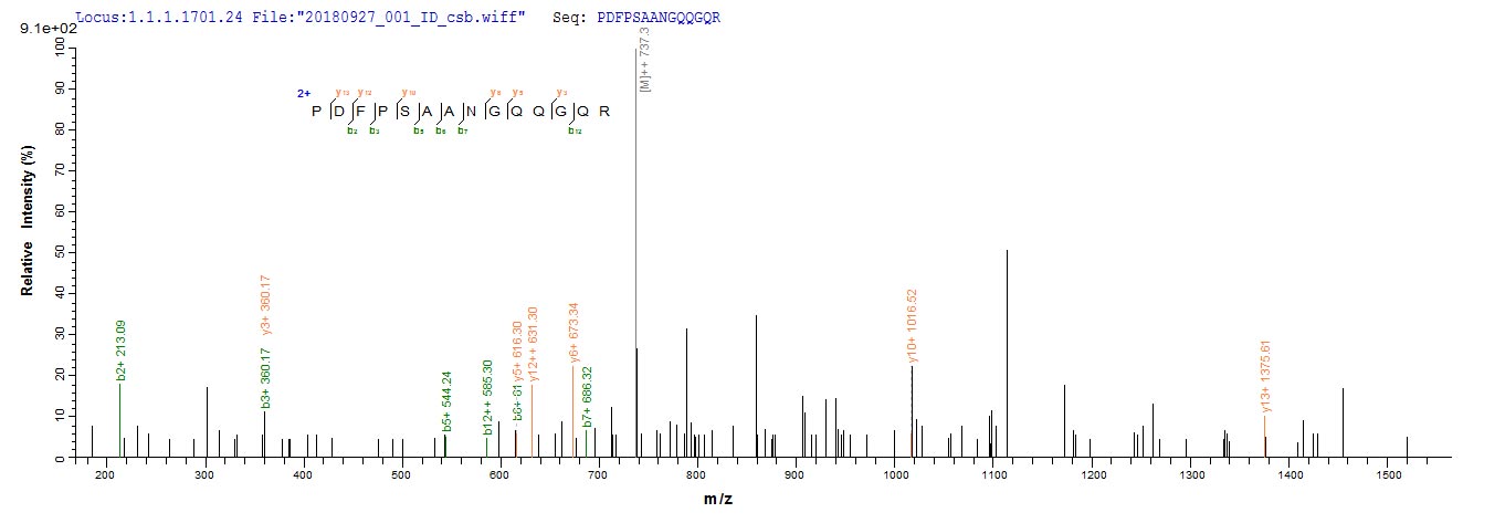 Based on the SEQUEST from database of Yeast host and target protein, the LC-MS/MS Analysis result of CSB-YP347478THA could indicate that this peptide derived from Yeast-expressed Toxocara canis (Canine roundworm) TES-26.