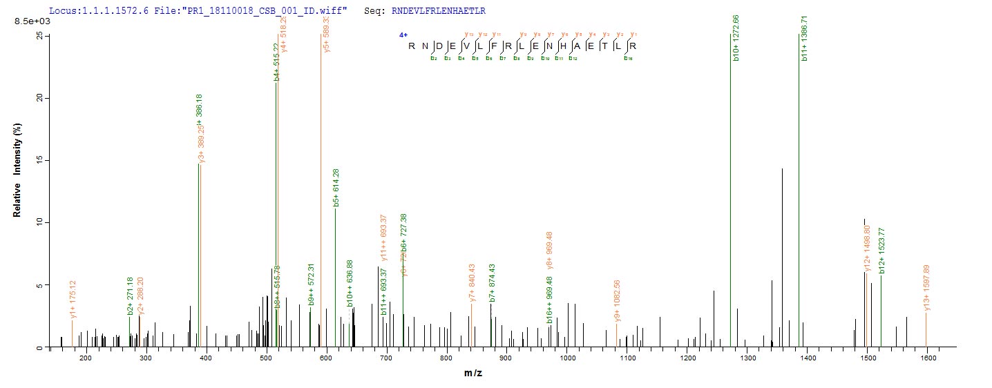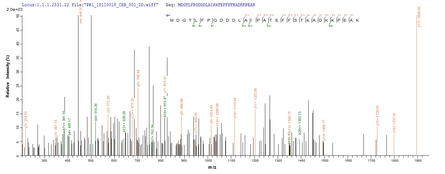 Based on the SEQUEST from database of Baculovirus host and target protein, the LC-MS/MS Analysis result of CSB-BP324948VAA could indicate that this peptide derived from Baculovirus-expressed Vaccinia virus (strain Copenhagen) (VACV) A27L.