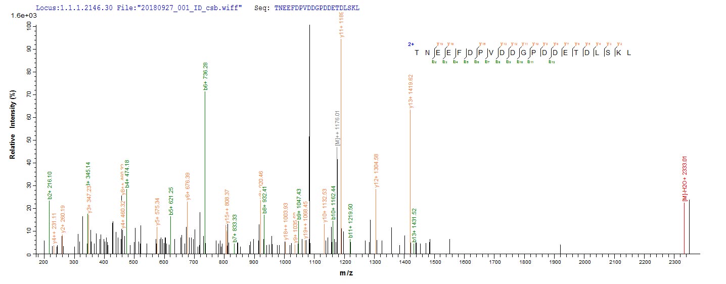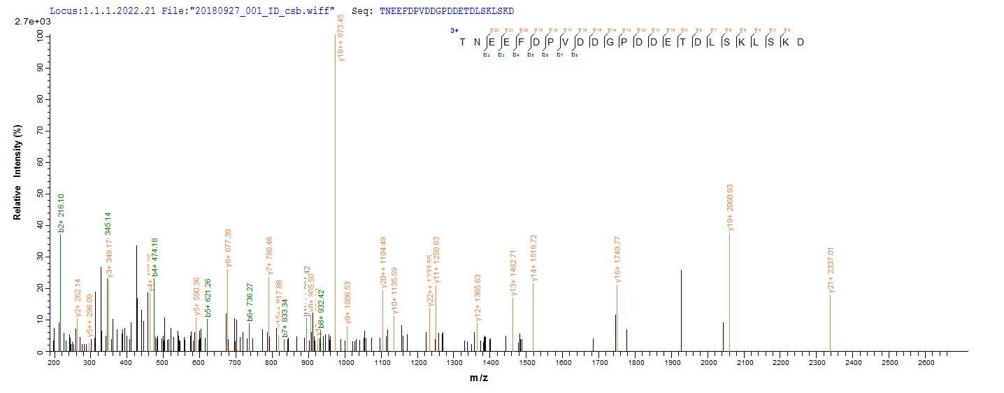 • Based on the SEQUEST from database of Yeast host and target protein, the LC-MS/MS Analysis result of CSB-YP312446VAI could indicate that this peptide derived from Yeast-expressed Vaccinia virus (strain Western Reserve) (VACV) (Vaccinia virus (strain WR)) PS/HR.