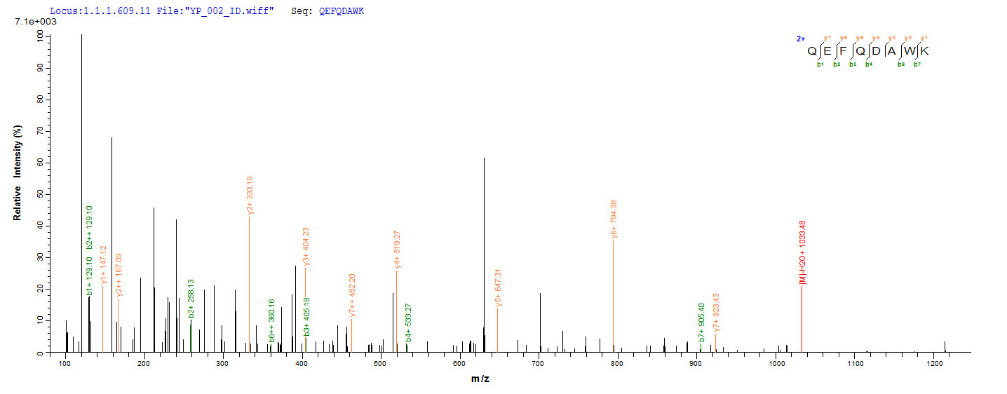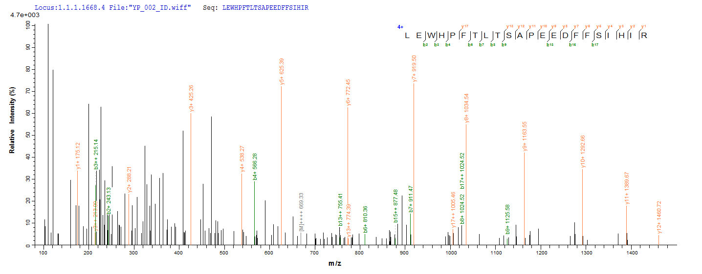 Based on the SEQUEST from database of Yeast host and target protein, the LC-MS/MS Analysis result of CSB-YP006325HU1 could indicate that this peptide derived from Yeast-expressed Homo sapiens (Human) CYBB.