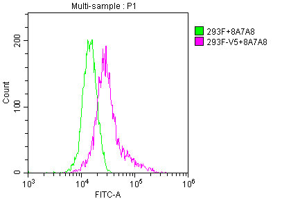 Overlay histogram showing untransfected HEK293F cells (green line) or transfected HEK293F cells (red line) stained with CSB-MA000161M0m. The cells were fixed with 70% Ethylalcohol (18h) and then permeabilized with 0.3% Triton X-100 for 2 min. The cells were then incubated in 10% normal goat serum to block non-specific protein-protein interactions followed by the antibody (1:200/1*106cells) for 1 h at 4°C. The secondary antibody used was FITC goat anti-mouse IgG(H+L) at 1/100 dilution for 30min at 4°C. Acquisition of >10,000 events was performed.