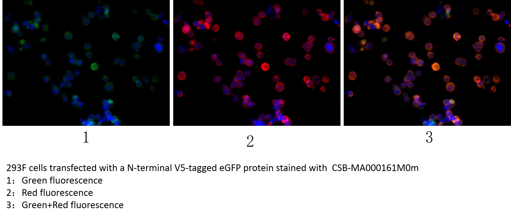 Immunofluorescence staining of transfected HEK293F cells with CSB-MA000161M0m at 1:100, counter-stained with DAPI. The cells were fixed in 4% formaldehyde, permeabilized using 0.2% Triton X-100 and blocked in 10% normal Goat Serum. The cells were then incubated with the antibody overnight at 4°C. The secondary antibody was Alexa Fluor R-PE Goat Anti-Mouse IgG(H+L).