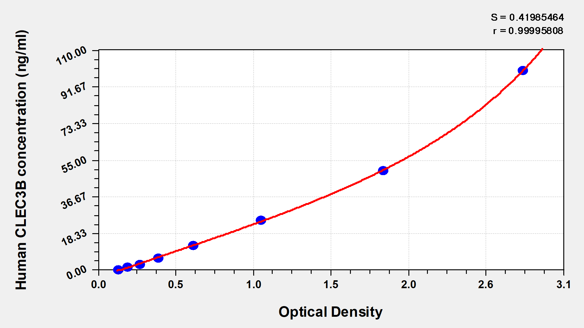 通過線性范圍來計算出實際的檢測樣本值,定量試劑盒標準曲線的相關系數R大于0.99。以CSB-E07270h(人脂聯素(ADP)ELISA Kit)為例的標準曲線。