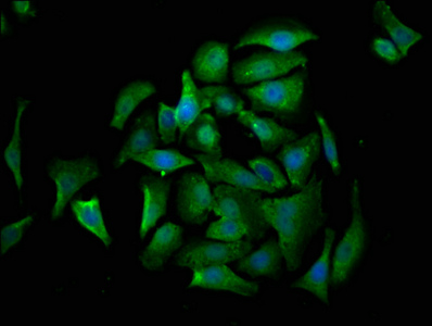 • Immunofluorescence staining of A549 cells with CSB-PA005938HA01HU at 1:530, counter-stained with DAPI. The cells were fixed in 4% formaldehyde, permeabilized using 0.2% Triton X-100 and blocked in 10% normal Goat Serum. The cells were then incubated with the antibody overnight at 4°C. The secondary antibody was Alexa Fluor 488-congugated AffiniPure Goat Anti-Rabbit IgG(H+L).