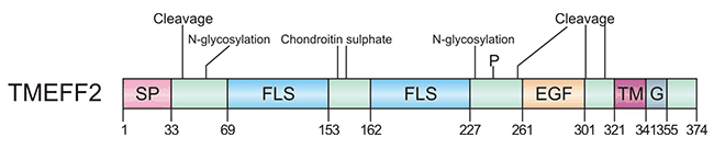 TMEFF2作為具有表皮生長因子EGF樣和FS樣結構域蛋白,胞外區FS樣功能域,可與轉化生長因子-β家族(TGF-β超家族)、血管內皮生長因子(VEGF)以及血小板衍生生長因子(PDGF)等結合,并抑制其受體活化;胞外區EGF樣結構,可參與細胞內的信號轉導 [2]。