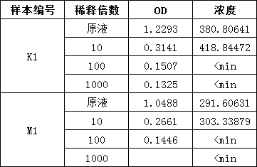 待測樣本為腦組織K1、M1(為隨機編號),選擇不同的稀釋倍數做預實驗,其相應的OD如下: