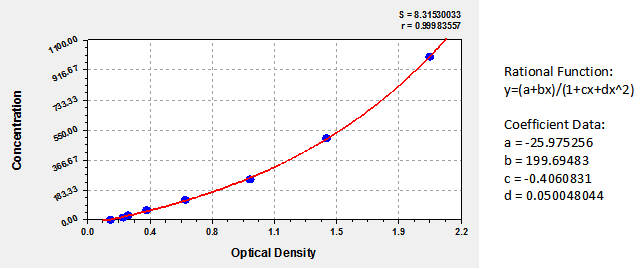 通過標準品的OD及濃度值,運用Curve Expert 1.4 軟件,繪制標準曲線,如下: